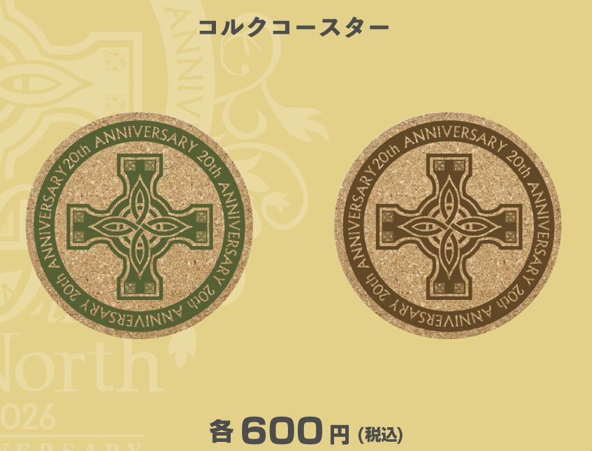 20周年記念グッズのコルクコースターです。 グリーンとブラウンの2色になります。 サイズ:90×90mm 材質:コルク color:グリーン、ブラウン